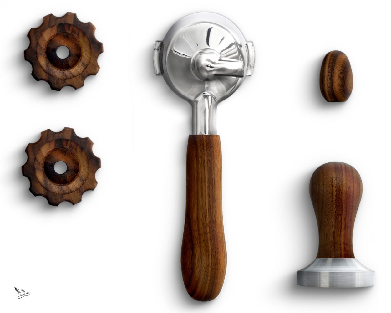 - Ein kompletter Siebträger nach Wunsch: entweder solo, doppio oder bodenloser Körper komplett gefertigt aus AISI304 Edelstahl, Siebspange und ausbalanciertem Echtholzgriff