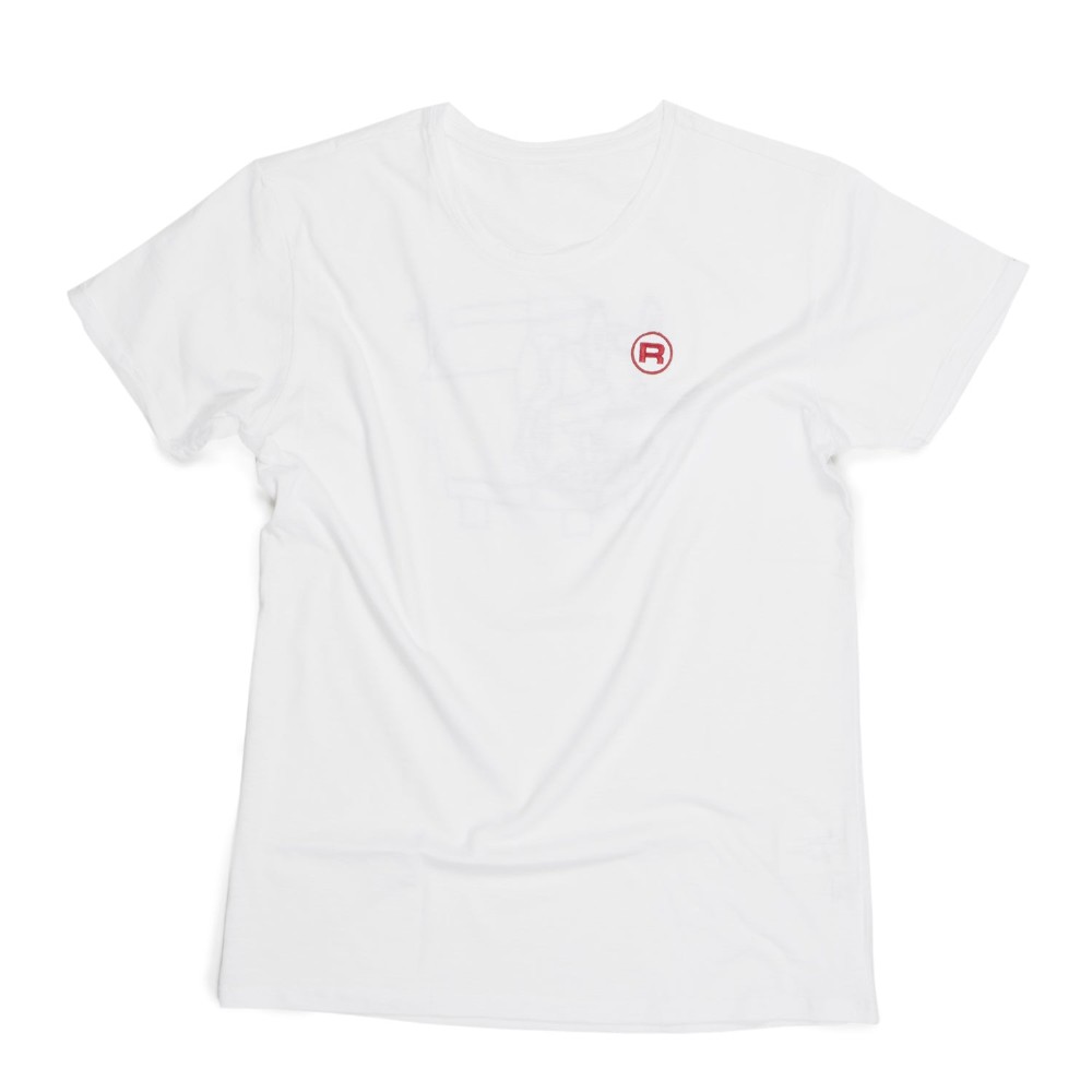 Premium-T-Shirt aus Baumwolle mit weitem Ausschnitt aus Strick, erhältlich in Damen- und Herrenschnitten mit der Option der Farben Schwarz oder Weiß. Gesticktes R-Symbol auf der Vorderseite und Giotto-Illustration auf der Rückseite des T-Shirts.